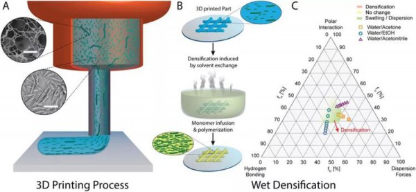 蘇黎世聯邦理工學院A.R. Studart教授課題組將3D打印技術與濕法致密化工藝相結合,極大提高了材料中纖維素的濃度,3D打印複合材料顯示出了高度有序的微觀結構和顯著增強的機械性能,其性能明顯高於已報道的3D打印纖維素基材料。相關工作以“Complex-Shaped Cellulose Composites Made by Wet Densification of 3D Printed Scaffolds”為題,發表於《先進功能材料》上。複合材料的製備過程研究人員采用兩步法來製備具有高納米纖維濃度的複雜結構複合材料:首先打印具有高度有序微觀結構的纖維素支架,隨後是通過溶劑置換過程對打印支架進行濕致密化(圖1)。所打印的油墨由纖維素納米晶與纖維素兩部分組成,研究人員引入盡可能高的纖維素納米晶來實現打印支架中纖維素的濃度最大化,擠出過程則使得纖維素納米晶定向排列(圖1A);隨後,將打印物體浸入選定成分的溶劑浴中,使纖維素支架致密化(圖1B),當溶池中的液體是纖維素的不良溶劑時,會導致纖維素之間相互吸引,實現致密化;研究人員還利用文獻報道的Hansen溶解度參數來評估了相應的溶劑量(圖1C)。