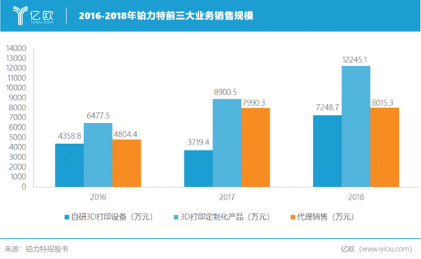 代理銷售競爭對手EOS產品的業務,最能反映鉑力特建立品牌認知和市場開拓的艱難。2018年,鉑力特代理銷售設備及配件模塊業務營收8015萬元,占全年總營收的27.64%,僅次於3D打印定製化產品業務。過往三年,鉑力特代理設備銷售業務也一直是公司第二大營收來源。