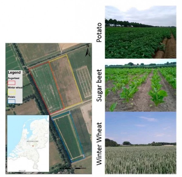 左:研究區域內(nei) 的田地概況:指示了要研究的三種不同田地和農(nong) 作物。右:本研究中使用的三種不同作物。