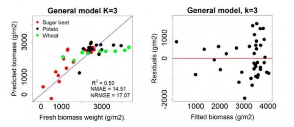 該研究利用3DPI算法估算生物量,利用每平方米可變數量最高點的平均高度估算作物高度。結果得出,利用該方法可以準確估計甜菜(R2= 0.68,RMSE = 17.47 g / m2)和冬小麥(R2= 0.82,RMSE = 13.94 g / m2)的生物量。同時,也可以準確估計甜菜(R2= 0.70, RMSE = 7.4 cm)和冬小麥(R2= 0.78, RMSE = 3.4 cm)的作物高度。然而,馬鈴薯株高(R2=0.50,RMSE=12cm)和生物量估算(R2=0.24,RMSE=22.09g/m2),由於(yu) 其複雜的冠層結構和種植馬鈴薯的壟狀結構,其可靠性較差。最後,本文還指出,通常情況下,對於(yu) 利用該方法進行精準生物量和作物高度估計,飛行條件(高度、速度、飛行路線的位置)應該與(yu) 校準模型的設置相當,因為(wei) 變化的條件會(hui) 對估計的作物生物量和株高產(chan) 生強烈影響。