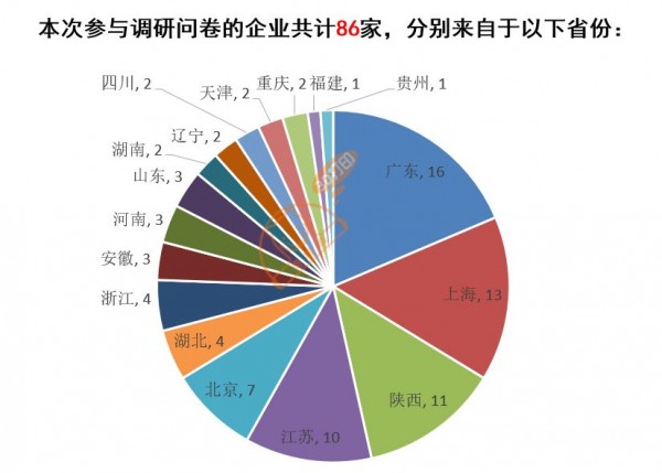 1. 本次參與調研問卷的3D打印企業共計86家,排名前五的是廣東、上海、陝西、江蘇、北京,這也與全國3D打印企業區域聚集度相符。