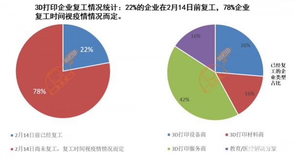 2. 我們以2月14日為統計的時間點,在2月14日前複工的3D打印企業隻有22%,而78%的企業未能在2月14日前複工,複工時間將會視疫情情況而定;