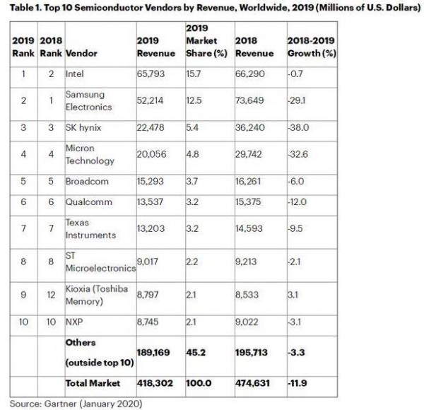 2020年1月8日,三星電子交上了一份沉重的成績單,2019年全年營業(ye) 收入約為(wei) 1956億(yi) 美元,相對於(yu) 2018年下降5.84%,營業(ye) 利潤約為(wei) 238億(yi) 美元,相對於(yu) 2018年暴跌52.95%。業(ye) 績大跌的直接結果是,三星電子剛坐了兩(liang) 年的全球芯片鐵王座,又被英特爾搶了回去。