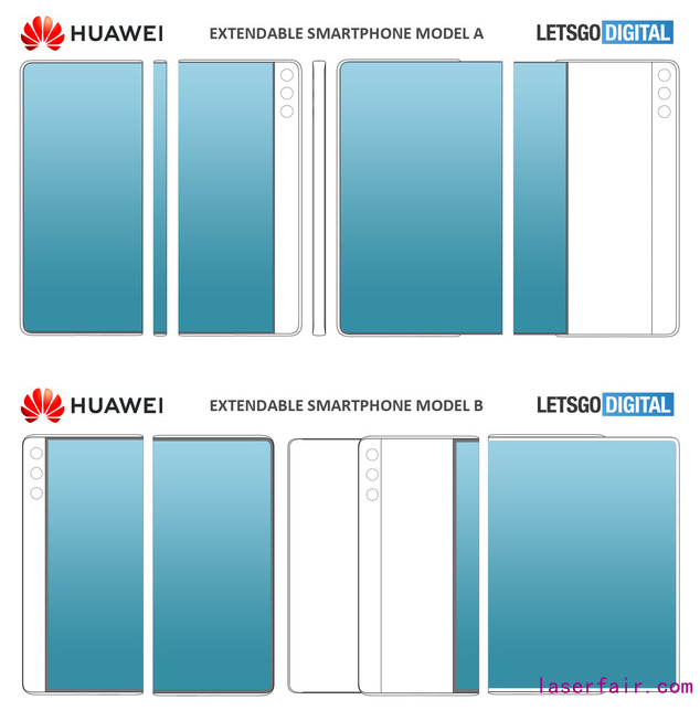 近日,有媒體(ti) 從(cong) 世界產(chan) 權組織網站發現了一份華為(wei) 全新專(zhuan) 利,描述了一種全新類型的伸縮屏產(chan) 品。 從(cong) 專(zhuan) 利圖片上看,這種產(chan) 品看起來與(yu) 目前的折疊屏十分相似,一整塊屏幕分布在機身前後兩(liang) 側(ce) ,但在使用方式上卻大為(wei) 不同。