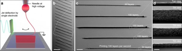 從(cong) 他們(men) 的測試中,研究人員能夠通過層層沉積高達100米的材料,以及非常高的縱橫比和高速來打印物體(ti) :“快速噴射和這些高層次性頻率轉化為(wei) 高達0.5米s的打印速度。?1平麵和0.4毫米秒?1飛機外,即在垂直方向上,在生產(chan) 等效特征尺寸時,擠壓和按需下降的EHD技術比可實現的速度快三到四個(ge) 數量級。“