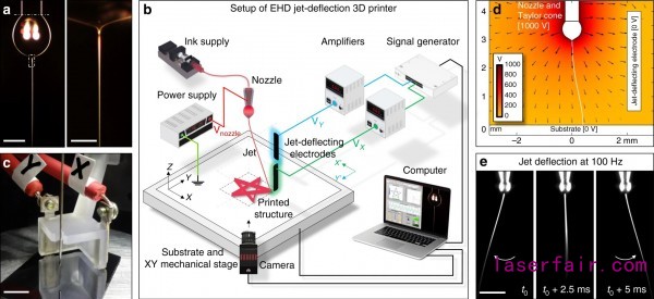 為(wei) 了克服EHD噴射過程的局限性,研究人員提出用電極來修飾電場。使用傳(chuan) 統的ehd打印機,研究人員將電極放置在射流周圍,並控製它們(men) 的電壓,以橫向加速度高達106米的速度連續調整其軌跡。?2。這使得噴射器能夠進行超快的靜電偏轉,使納米纖維被堆疊起來,以打印具有亞(ya) 微米特征的3D物體(ti) 。