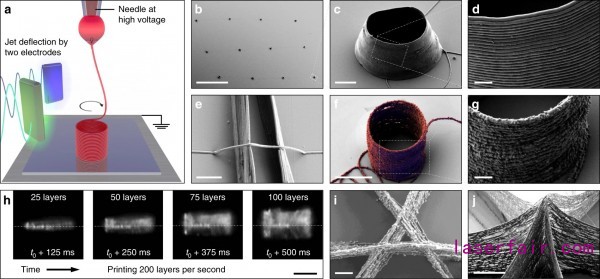 本文詳細介紹了這一新技術,闡述了為(wei) 克服現有增材製造技術對生產(chan) 速度的限製,提出了靜電射流偏轉法。從(cong) 他們(men) 的測試中,研究人員發現靜電射流偏轉可以通過層層疊加納米纖維來打印具有亞(ya) 微米特征的三維物體(ti) ,頻率高達2000赫茲(zi) 。