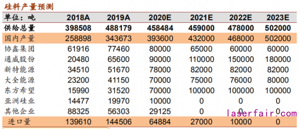 矽料市場向頭部企業(ye) 集中,五大格局基本形成。從(cong) 矽料品質和完全成本兩(liang) 個(ge) 維度看,矽 料市場大概率集中於(yu) 國內(nei) 五大矽料廠。從(cong) 盈利水平和資金實力來看,通威實力最強,目 前正在擴建保山一期和樂(le) 山二期各 4 萬(wan) 噸,到 2021 年底通威將形成 17 萬(wan) 噸產(chan) 能,成 為(wei) 矽料行業(ye) 龍頭。預計 2020-2023 年矽料供給分別為(wei) 45.8/45.9/47.8/50.2 萬(wan) 噸,當前 供給最為(wei) 寬鬆,後麵隨著疫情消退,需求將逐漸恢複,2021 年矽料供應將偏緊。