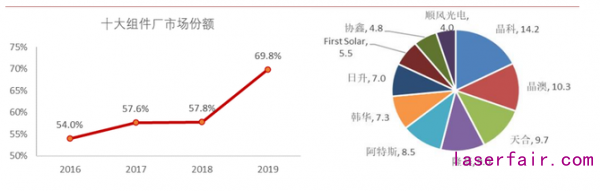 2019 年十大組件廠市場占比 70%,同比提升 12CPT, 較 2018 年大幅提升,組件集中度提升加速。年初以來受疫情影響,存量市場下訂單爭(zheng) 奪較為(wei) 激烈,部分不具備競爭(zheng) 力的組件廠停產(chan) ,頭部大廠進一步提升市場份額。