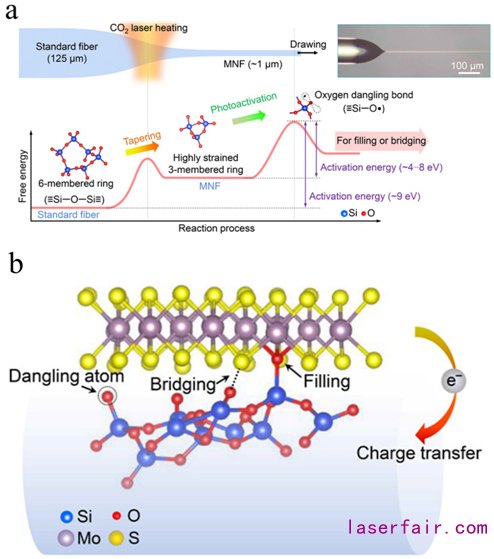 圖(a)上圖CO?激光器拉製光纖過程,下圖代表SiO?為(wei) 機構單元的光纖平均能量變化,從(cong) 六元環到三元環,再到懸掛鍵。插圖是光學顯微鏡下微納光纖實物圖。