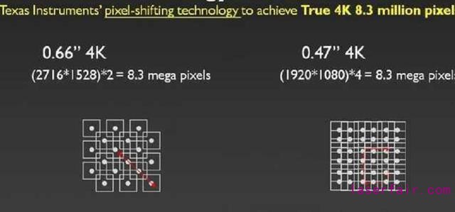DLP XPR技術本質上是一種像素位移技術,通過像素的"抖動",它能夠讓激光電視成像芯片的顯微鏡與(yu) 120Hz頻率對角位移,實現暫時的分辨率增強。雖然增強後紙麵像素達到了4K標準,但實際分辨率隻有830萬(wan) 左右,清晰度也僅(jin) 為(wei) 4K電視的1/4,所以才會(hui) 給人模糊不清的感覺。