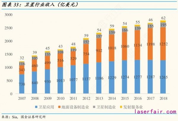 據美國衛星工業(ye) 協會(hui) (SIA)數據顯示,2018年衛星行業(ye) 產(chan) 值為(wei) 2774億(yi) 美元,其中子板塊衛星應用產(chan) 值1265億(yi) 美元、地麵設備製造1252億(yi) 美元,兩(liang) 者合計占比超90%。另衛星製造產(chan) 值195億(yi) 美元,衛星發射62億(yi) 美元,占比約10%。
