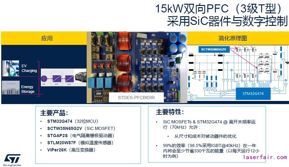沐傑勵表示,意法半導體(ti) 在SiC器件方麵,擁有廣泛的解決(jue) 方案,包括分立器件、裸芯片、模塊和持續擴大的產(chan) 能,以支持市場的加速擴張。本次交流會(hui) 上,意法半導體(ti) 展示了采用SiC器件與(yu) 數字控製的15kW雙向PFC(3級T型),解決(jue) 方案涵蓋32位MCU STM32G474、SiC MOSFET SCTW35N65G2V、電氣隔離柵極驅動器STGAP2S、模擬溫度傳(chuan) 感器STLM20W87F、高壓變換器VIPer26K。SiC MOSFETs搭配STM32G474可實現70kHz高開關(guan) 頻率運行,實現更高的運行效率,預計一年內(nei) 將會(hui) 至少節省330千瓦的能量(以每天運行12小時為(wei) 例)。