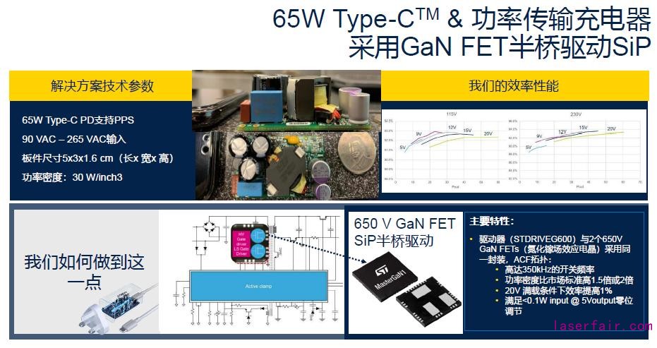 由於(yu) GaN的禁帶寬度較大,利用GaN可以獲得更大帶寬、更大放大器增益、生產(chan) 尺寸更小的半導體(ti) 器件。在工業(ye) 市場,GaN器件產(chan) 品包括SBD、FET等麵向無線充電、電源開關(guan) 等的產(chan) 品。目前市麵上的GaN充電器可支持USB快充,以27W、30W和45W功率居多。在本次見麵會(hui) 上,意法半導體(ti) 介紹了采用一款采用GaN FET SiP 半橋驅動的65W Type-C & PD充電器。該方案的驅動器與(yu) 2個(ge) 650V GaN FETs采用同一封裝,開關(guan) 頻率達到350kHz,功率密度比市場標準高1.5倍至2倍。