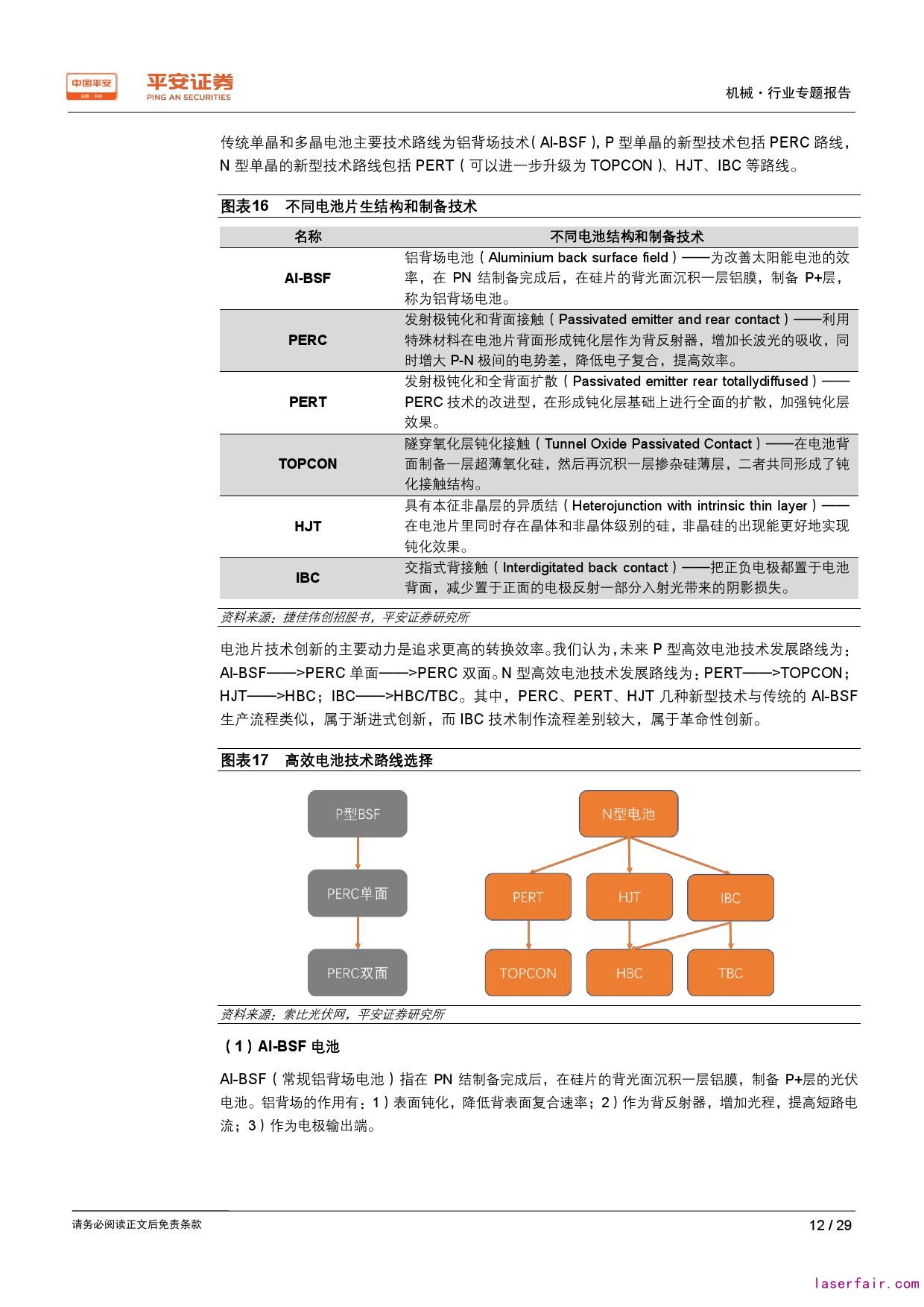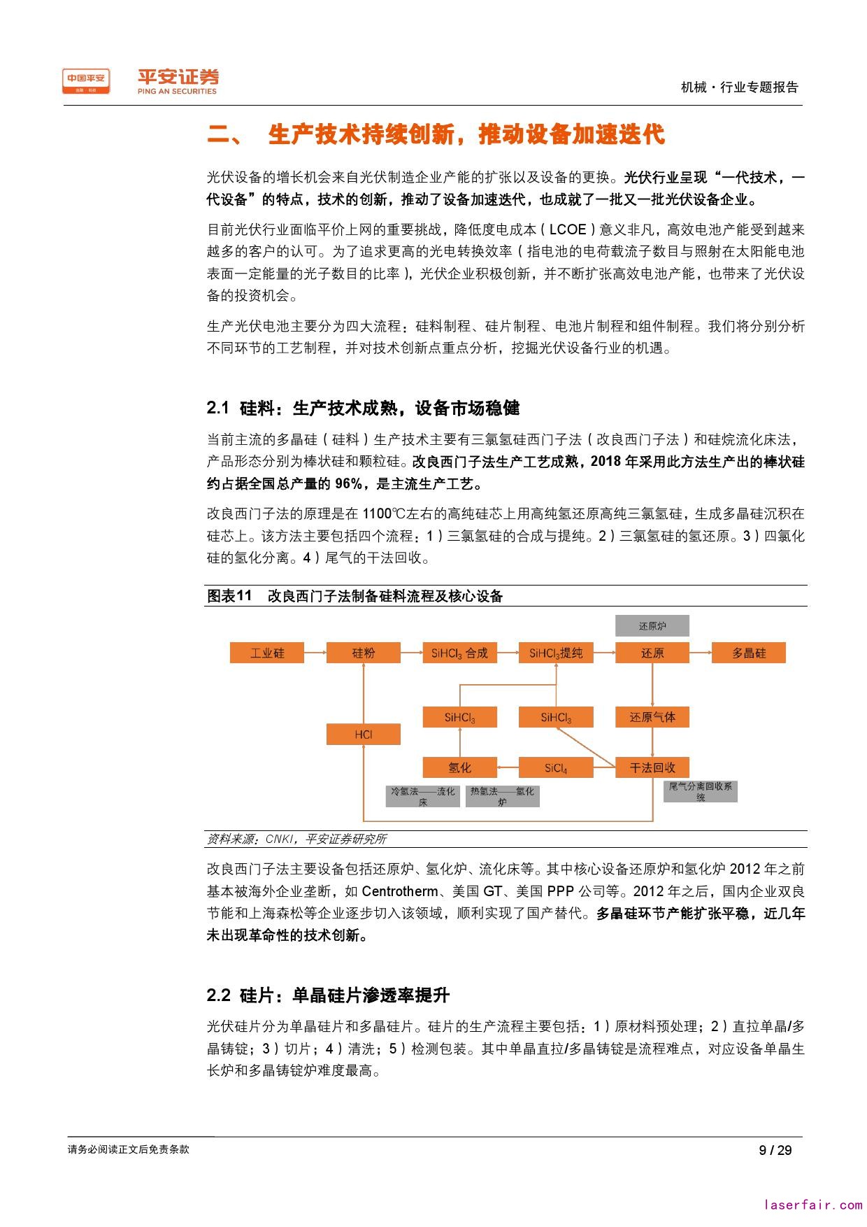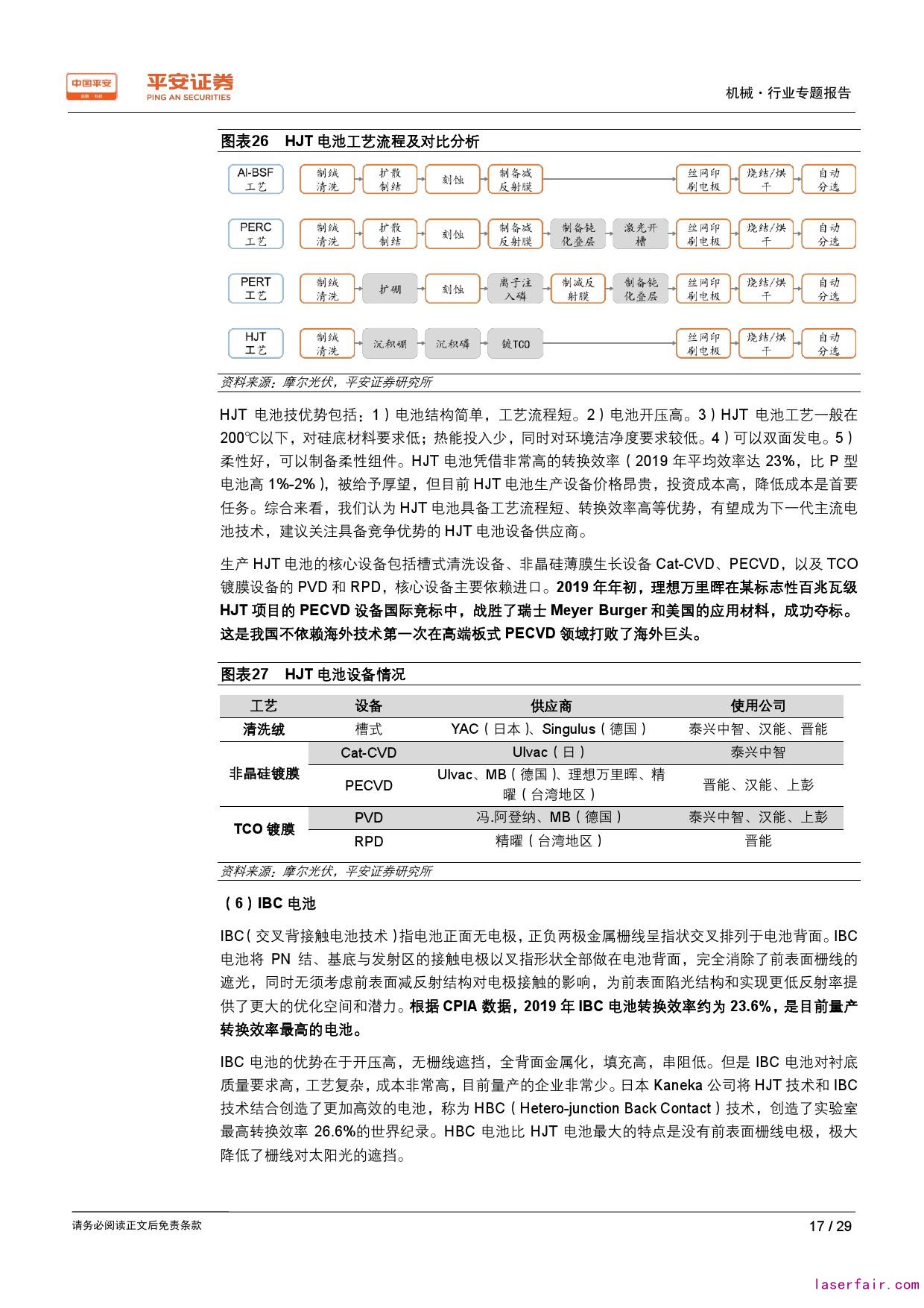 生產(chan) 技術持續創新,推動設備加速迭代。光伏行業(ye) 麵臨(lin) 平價(jia) 上網的挑戰,發展新型的高效電池成為(wei) 重要的突破口。行業(ye) 呈現“一代技術,一代設備”的現象,生產(chan) 技術的創新將推動設備迭代。光伏電池生產(chan) 包括四大流程:矽料製程、矽片製程、電池片製程和組件製程。在矽片環節,單晶矽成為(wei) 發展趨勢,帶動單晶矽片產(chan) 能擴張。在電池片領域,PERC電池持續擴張,N型電池(PERT、HJT、IBC電池)蓄勢待發。在組件領域,多主柵、半片和疊片組件滲透率持續提升。建議關(guan) 注單晶矽生長設備,PERC和N型電池片設備,以及新型組件技術帶來的激光劃片機、多主柵串焊機和疊片機等設備的投資機會(hui) 。
