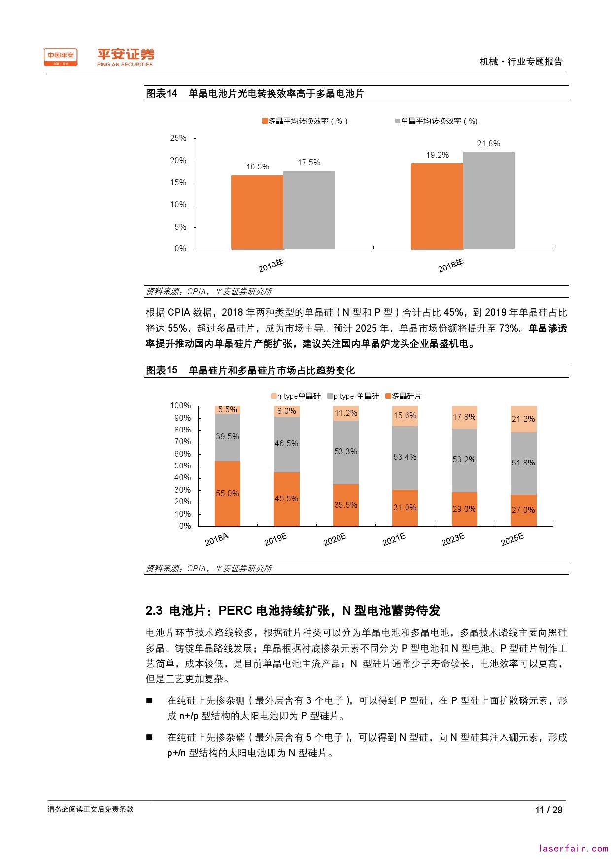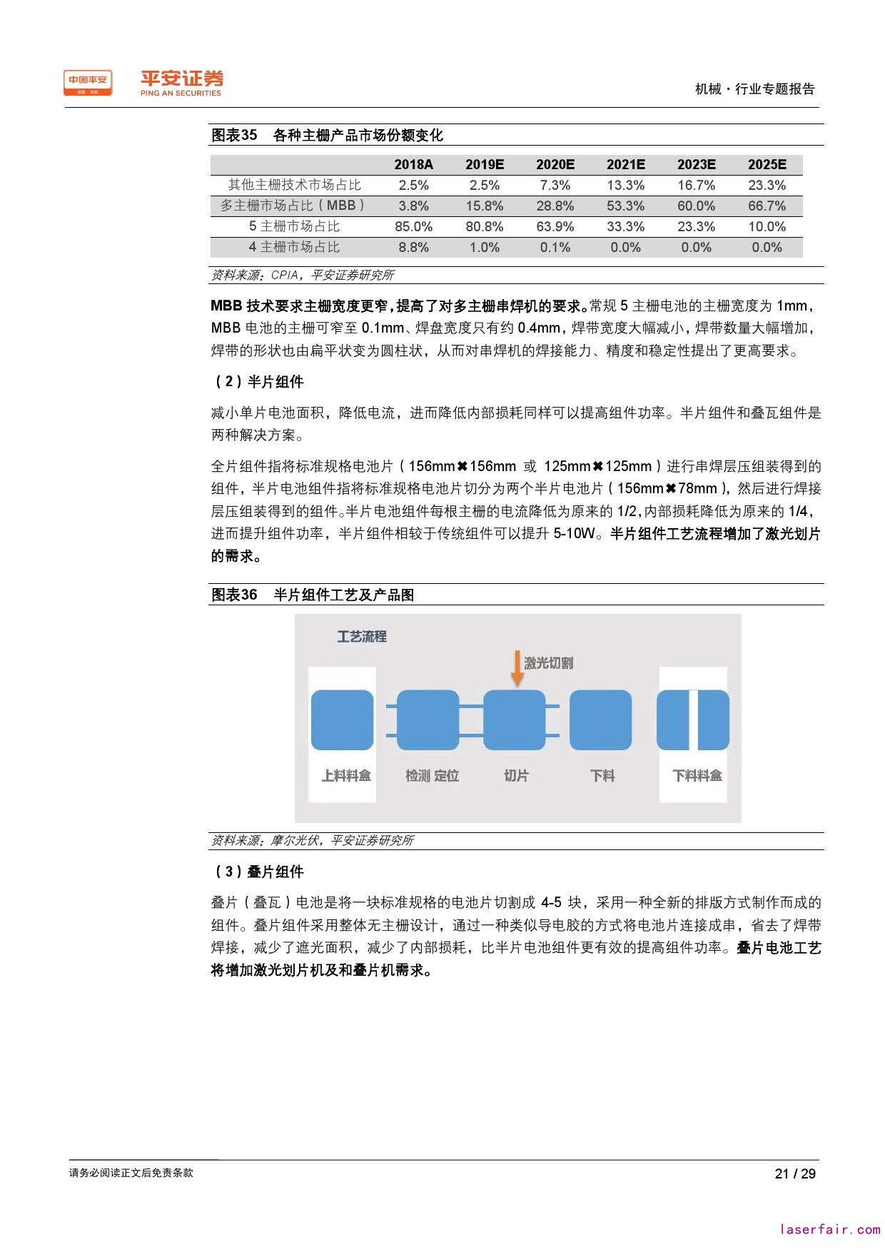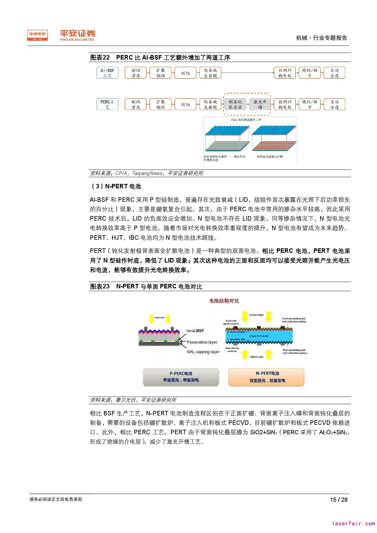 生產(chan) 技術持續創新,推動設備加速迭代。光伏行業(ye) 麵臨(lin) 平價(jia) 上網的挑戰,發展新型的高效電池成為(wei) 重要的突破口。行業(ye) 呈現“一代技術,一代設備”的現象,生產(chan) 技術的創新將推動設備迭代。光伏電池生產(chan) 包括四大流程:矽料製程、矽片製程、電池片製程和組件製程。在矽片環節,單晶矽成為(wei) 發展趨勢,帶動單晶矽片產(chan) 能擴張。在電池片領域,PERC電池持續擴張,N型電池(PERT、HJT、IBC電池)蓄勢待發。在組件領域,多主柵、半片和疊片組件滲透率持續提升。建議關(guan) 注單晶矽生長設備,PERC和N型電池片設備,以及新型組件技術帶來的激光劃片機、多主柵串焊機和疊片機等設備的投資機會(hui) 。