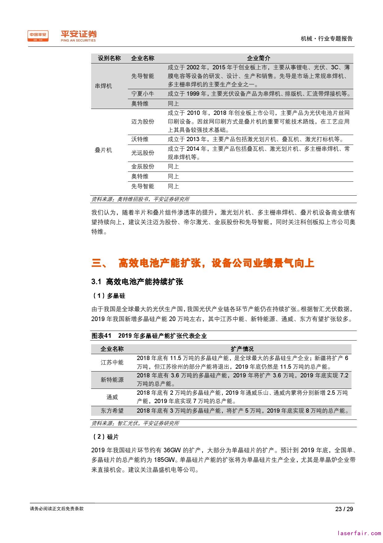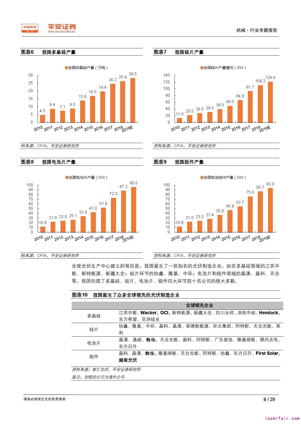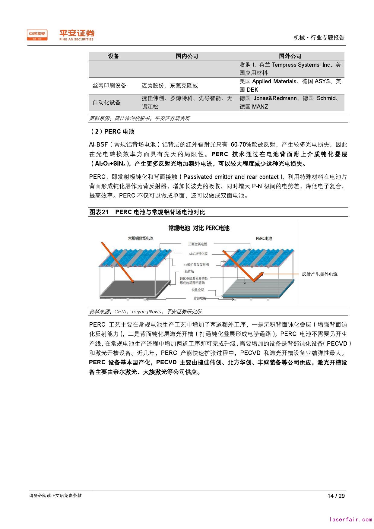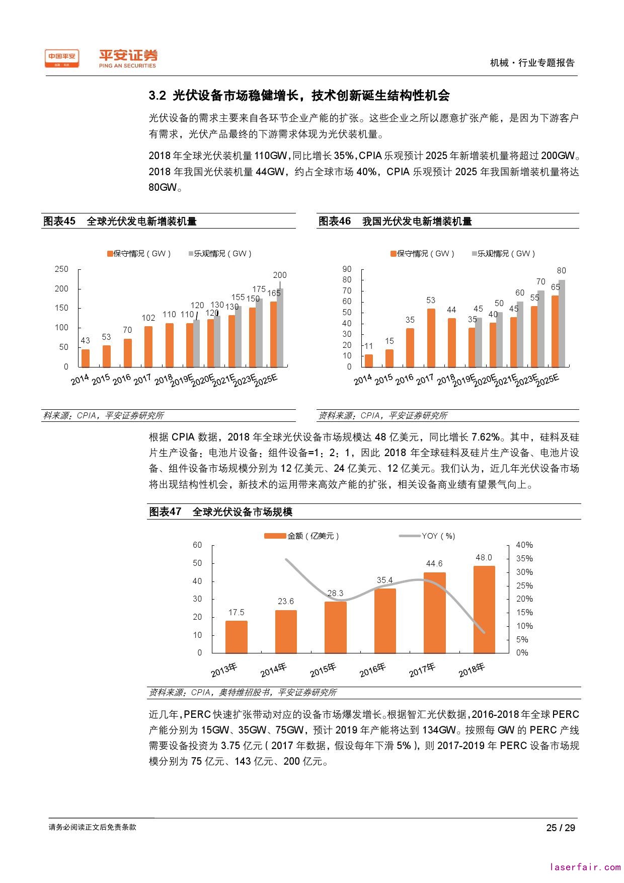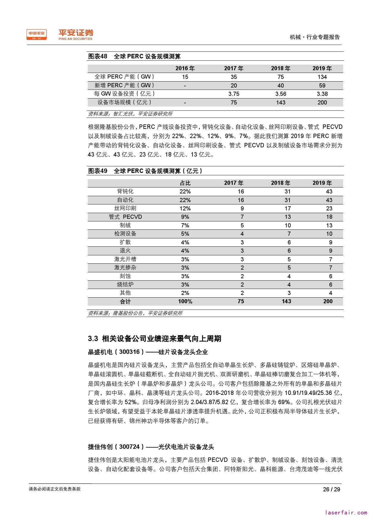 高效電池產(chan) 能擴張,設備公司機遇多。預計2019年我國矽料、矽片、電池片、組件分別擴張產(chan) 能約20萬(wan) 噸、36GW、50GW、20GW,均以高效電池產(chan) 能為(wei) 主。2018年全球光伏設備市場總規模達48億(yi) 美元,同比增長7.62%。預計2019年全球PERC電池片設備市場規模達200億(yi) 元,其中背鈍化設備、自動化設備、絲(si) 網印刷設備占比最高,分別為(wei) 43億(yi) 元、43億(yi) 元、23億(yi) 元。我們(men) 認為(wei) ,未來幾年光伏設備市場將出現結構性機會(hui) ,高效電池的設備商業(ye) 績有望景氣向上。