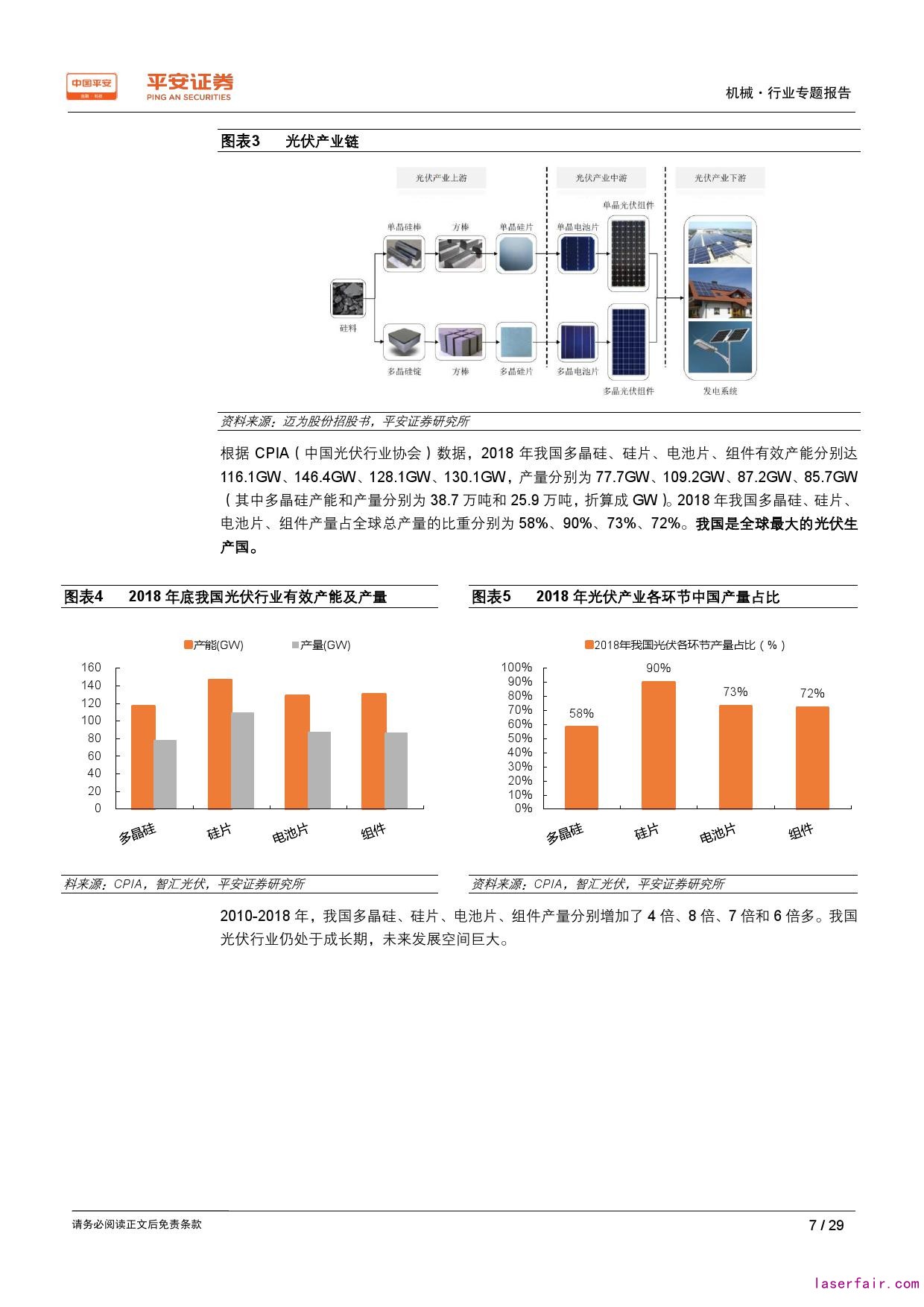 我國是全球最大的光伏生產(chan) 國。光伏電池是一種對光有響應並能將光能轉化為(wei) 電能的器件,所用的太陽能屬於(yu) 可再生能源。2018年底全球光伏累計裝機量達480GW,預計2030年有望達到1721GW,發展空間巨大。晶矽光伏電池產(chan) 業(ye) 鏈分為(wei) 矽料、矽片、電池片、組件、係統五個(ge) 環節,2018年我國矽料、矽片、電池片、組件產(chan) 量占全球總產(chan) 量的比重分別為(wei) 58%、90%、73%、72%,是全球最大的光伏生產(chan) 國,並誕生了江蘇中能、隆基股份、天合光能等一批優(you) 秀的光伏製造公司。