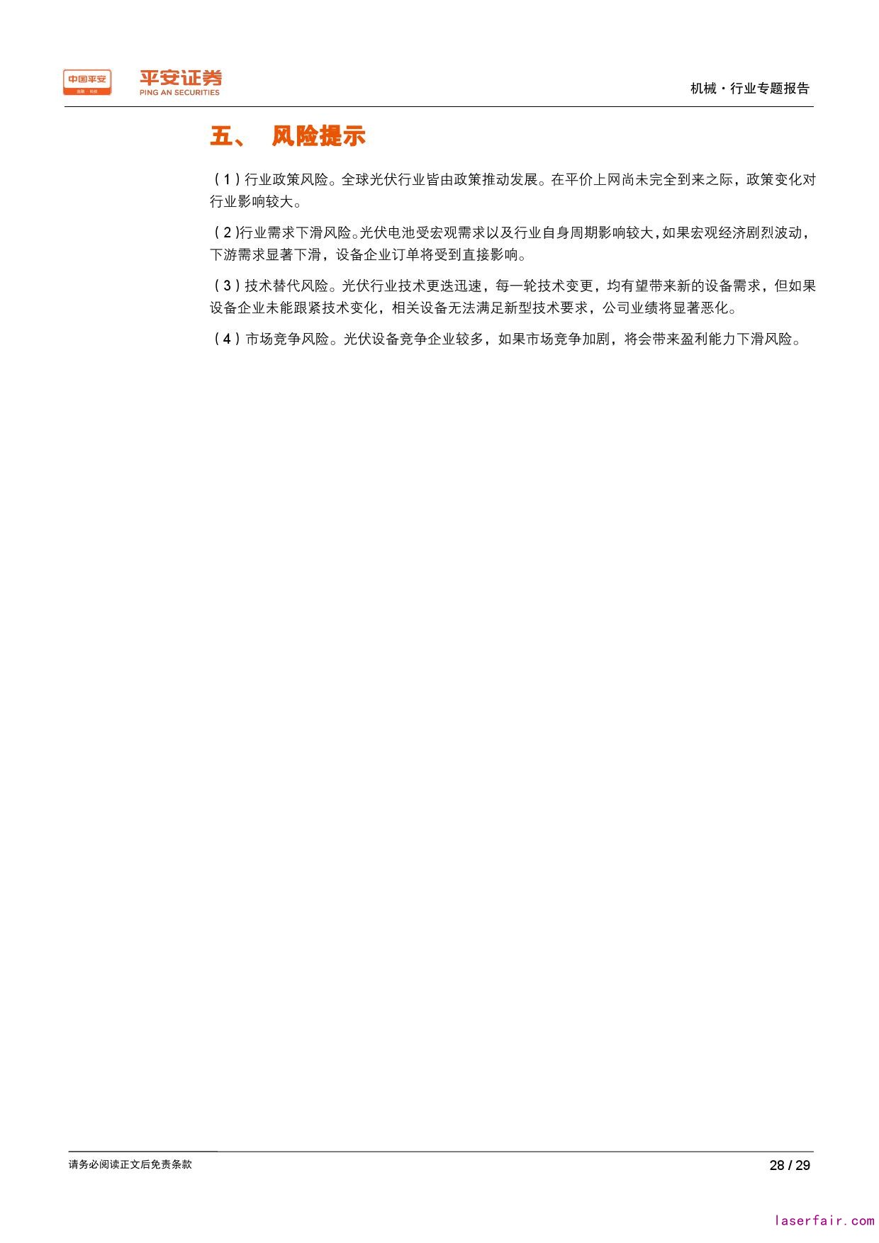 (2)行業(ye) 需求下滑風險。光伏電池受宏觀需求以及行業(ye) 自身周期影響較大,如果宏觀經濟劇烈波動,下遊需求顯著下滑,設備企業(ye) 訂單將受到直接影響。