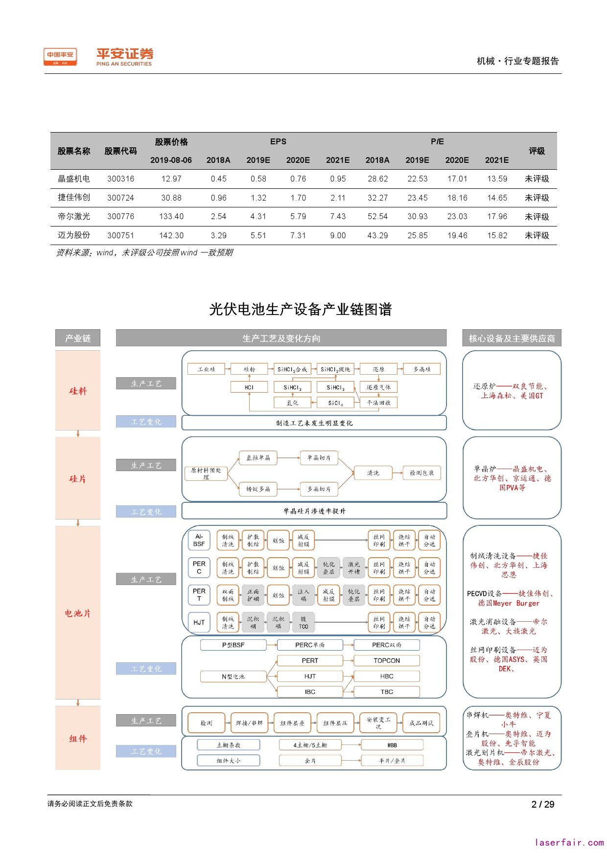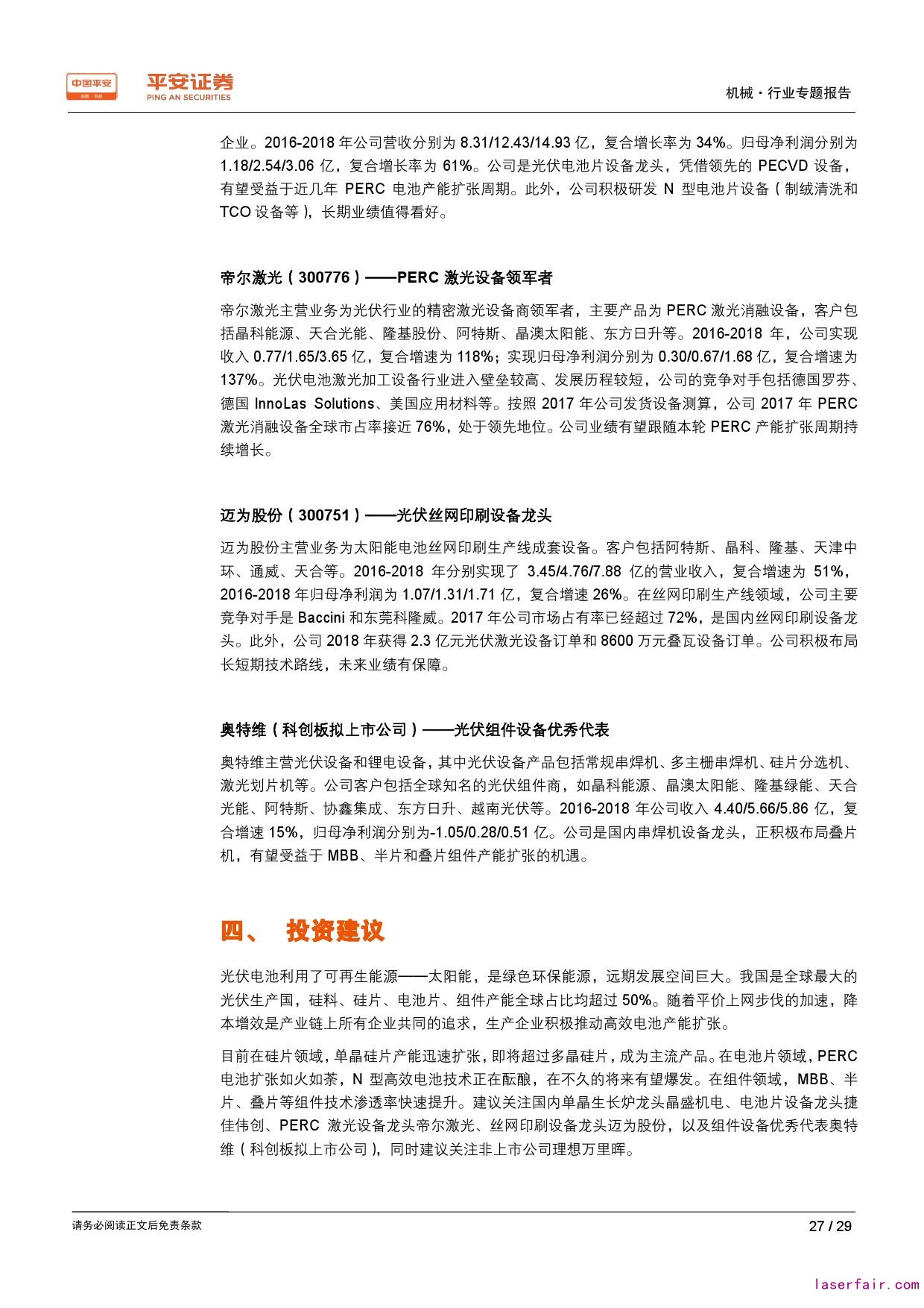 投資建議:隨著平價(jia) 上網步伐的加速,降本增效是產(chan) 業(ye) 鏈上所有企業(ye) 共同的追求。我國是全球最大的光伏生產(chan) 國,矽料、電池片和組件生產(chan) 企業(ye) 積極推動高效電池產(chan) 能擴張。建議關(guan) 注國內(nei) 單晶爐龍頭晶盛機電、電池片設備龍頭捷佳偉(wei) 創、PERC激光設備龍頭帝爾激光、絲(si) 網印刷設備龍頭邁為(wei) 股份,以及組件設備優(you) 秀代表奧特維(科創板擬上市公司),同時建議關(guan) 注非上市公司理想萬(wan) 裏暉。