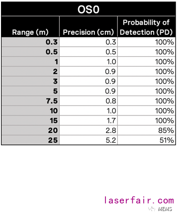 我們(men) 對OS0進行了實測演示,測距範圍為(wei) 25 m,目標物體(ti) 反射率為(wei) 10%。如下表所示,在1 m以內(nei) ,激光雷達的精度可達到±0.5 cm,而在1米處該精度降至±1 cm;當目標物移動至距離激光雷達1-10 m之間時,精度提高到±0.9 cm;超過10 m後,精度在25 m處幾何衰減至±5 cm。