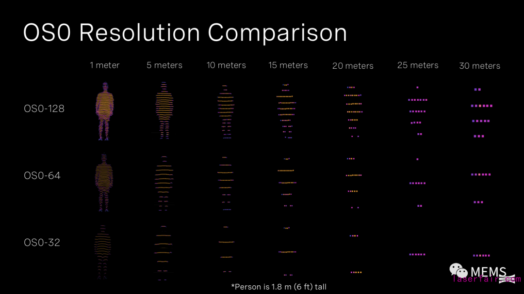 OS0係列分辨率對比,有效距離:OS0-32為(wei) 10 m,OS0-64為(wei) 20 m,OS0-128為(wei) 30 m