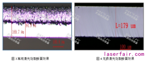 常規激光劃裂在電池表麵燒蝕形成的切割道:寬度為(wei) 30µm、深度為(wei) 60-90µm,同時表麵橫向熱影響區會(hui) 擴展到80µm左右,截麵形貌如圖3,50%左右截麵存在熱損傷(shang) ;而無損激光劃裂的矽片截斷麵幹淨、不存在損傷(shang) 點,主要原因是無損劃裂過程不存在激光高溫燒蝕過程。