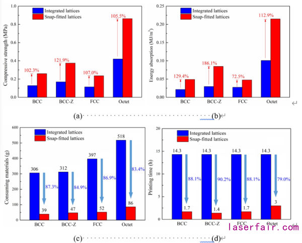 圖3.嵌鎖組裝製備的PolyJet點陣結構提升了力學性能、節約了製備成本。圖為(wei) 兩(liang) 種製備方法比較(a)壓縮強度;(b)比吸能;(c)打印耗材;(d)打印時間