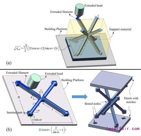 圖1.兩(liang) 種FDM點陣結構製備方法對比(a)一體(ti) 化3D打印;(b)打印+嵌鎖組裝