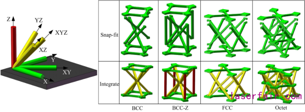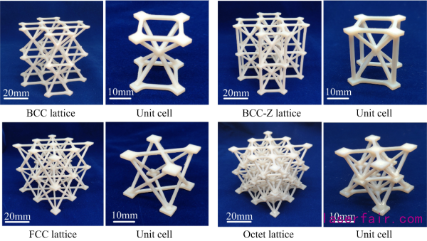 進一步將該方法拓展到聚合物噴射成型(PolyJet)技術中,製備了BCC、BCC-Z、FCC、Octet四類典型的點陣結構,實現了不同構型的PolyJet點陣結構中杆件的最佳打印方向(X-Y平麵)。