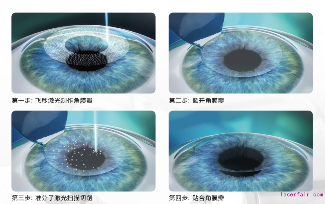 先用飛秒激光打開角膜,再用準分子激光把角膜裏麵的東(dong) 西“削”出一個(ge) “眼鏡”,再把角膜蓋回去就好了。