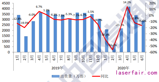 報告顯示,2020年6月,國內(nei) 手機市場總體(ti) 出貨量為(wei) 2863萬(wan) 部,同比下降16.6%。至此,今年上半年國內(nei) 手機市場總體(ti) 出貨量累計達到1.53億(yi) 部,同比下降17.7%。受新冠疫情影響,其中2月同比下降幅度最為(wei) 明顯,達到56%。