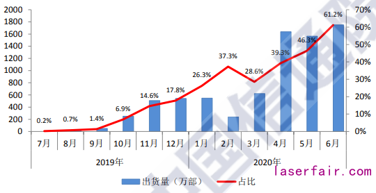 而在5G手機方麵,2020年6月,國內(nei) 市場5G手機出貨量為(wei) 1751.3萬(wan) 部,占同期手機出貨量的61.2%。上市新機型24款,占同期手機上市新機型數量的51.1%。上半年,國內(nei) 市場5G手機累計出貨量達到6359.7萬(wan) 部,上市新機型累計達到105款,占比分別為(wei) 41.5%和48.6%。