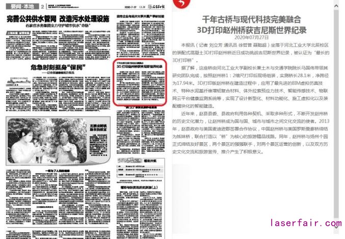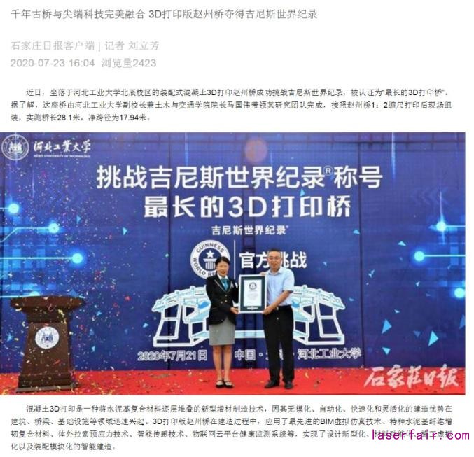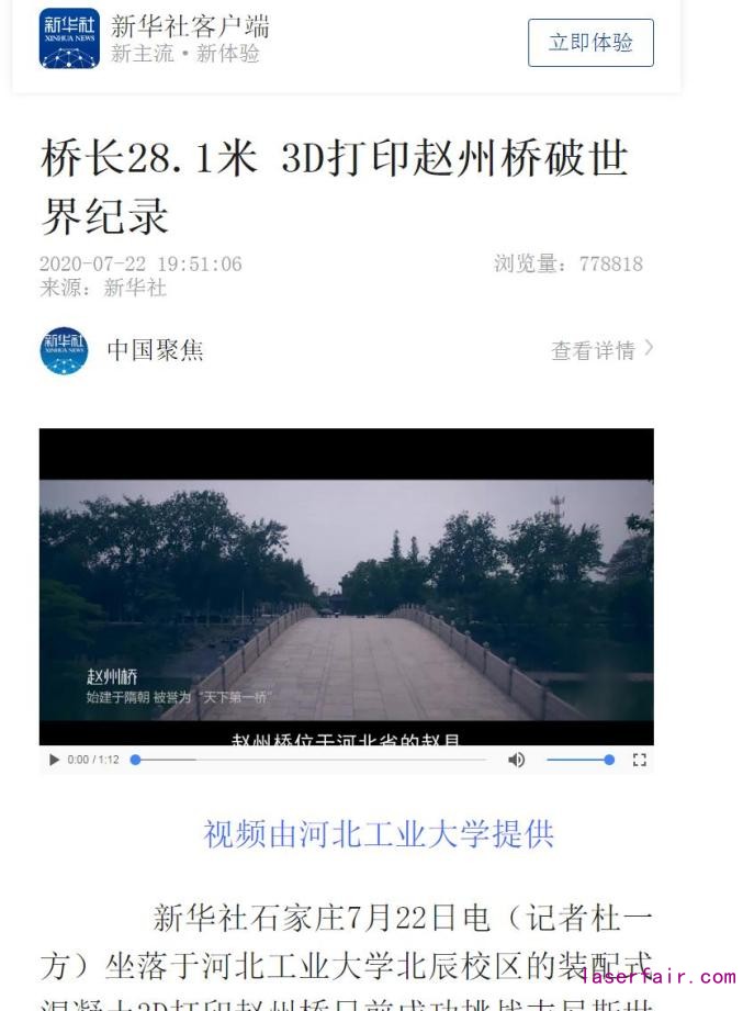 新華社石家莊7月22日電(記者杜一方)坐落於(yu) 河北工業(ye) 大學北辰校區的裝配式混凝土3D打印趙州橋日前成功挑戰吉尼斯世界紀錄,被認證為(wei) “最長的3D打印橋”。