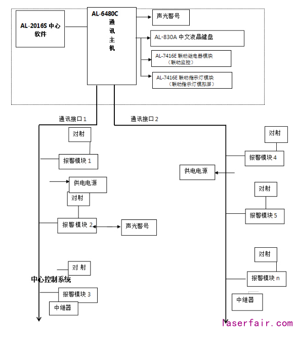 由於(yu) 小區周界長度比較大,故每400-500米做一個(ge) 現場聯動驅動警號,在相應區域內(nei) 的激光對射有人入侵後,迅速驅動旁邊的現場警號響及光提示,這樣可震懾強行入侵者;現場驅動設備采用RS485單防區帶一路繼電器輸出的地址模塊(AL-7480-1C),輸出方式可通過控製中心的總線主機靈活實現多點設置。
