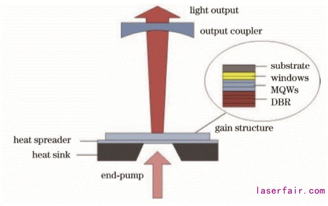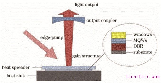 圖4為(wei) 背端抽運的OP - VECSEL及其增益芯片的結構,與(yu) 端麵抽運不同,其抽運光從(cong) 後腔鏡入射與(yu) 輸出光同軸同向。盡管抽運光斑不大,但可獲得更加均勻的圓形抽運光斑,並且抽運光耦合係統相對容易架設,結構緊湊,更有利於(yu) 激光的集成與(yu) 封裝。其增益芯片為(wei) 底發射結構,生長順序與(yu) 頂發射不同,先在襯底上生長窗口層,再生長MQWs,最後生長DBR。再將DBR焊接到金剛石或SiC散熱片上。另外,由於(yu) 抽運光通過DBR後才進入增益區,因此要盡量使DBR對抽運光透明,對激光波長有高反射。