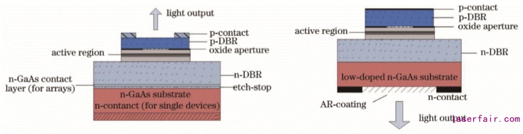 圖1 VCSEL結構簡圖。(a)頂發射結構;(b)底發射結構