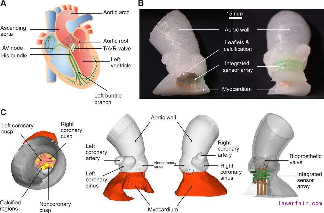 患者特定的3D打印主動脈根部模型的概念和組件的概述。(A)主動脈根部植入TAVR假體(ti) 的心髒示意圖。AV,房室。(B)具有內(nei) 部集成傳(chuan) 感器陣列的3D打印主動脈根模型。圖片來源:明尼蘇達大學,Ghazaleh Haghiashtiani和Kaiyan Qiu。(C)主動脈根部模型的不同組分。鈣化區域顯示為(wei) 黃色。膜隔的大致區域用藍色標記指示。