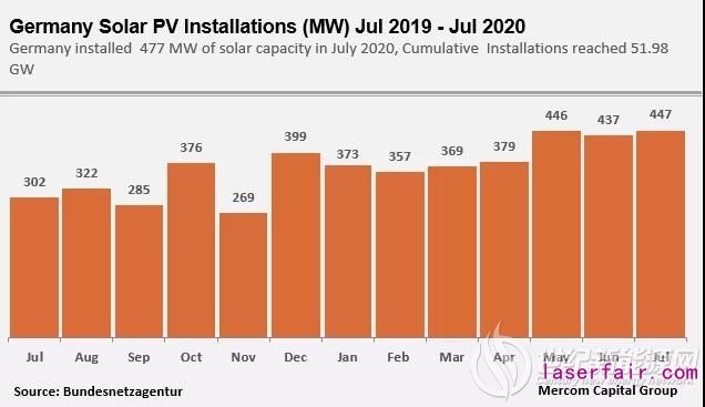 近日了解到,根據德國聯邦網絡機構Bundesnetzagentur公布的最新數據,德國在2020年7月安裝了447兆瓦太陽能容量,比2020年6月增加了11兆瓦(增長2.2%)。去年同月,德國安裝了302兆瓦。