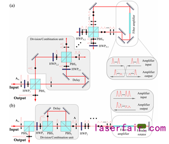 分脈衝(chong) 放大(Divided-pulse amplification, DPA)是一種常用的相幹合成技術:在DPA係統中,通過在放大前將初始脈衝(chong) 等分成時域上分離的子脈衝(chong) 串,以降低脈衝(chong) 在放大時的峰值功率;子脈衝(chong) 串經過放大之後重新合成為(wei) 一個(ge) 脈衝(chong) 。DPA的相幹合成效率主要受到三方麵的限製:(1)增益飽和導致子脈衝(chong) 間的強度差異;(2)非線性效應將子脈衝(chong) 間的強度差異轉化為(wei) 相位差異;(3)器件缺陷。本文介紹的兩(liang) 篇文獻均對啁啾脈衝(chong) -分脈衝(chong) 放大係統(CPA-DPA)進行了詳細的數值模擬,並重點研究了合成效率與(yu) 增益飽和的關(guan) 係。
