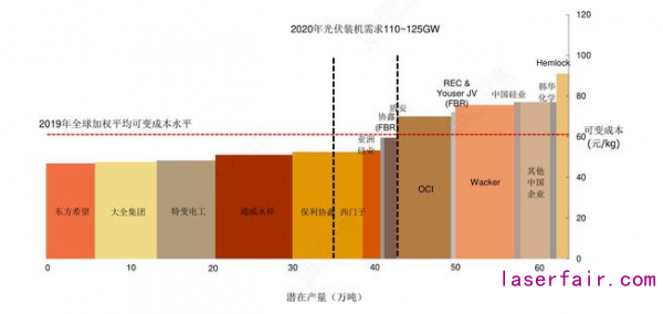 2019年全球矽料廠商加權平均可變成本水平在61元/kg左右,其中我國通威、大全、東(dong) 方希望等矽料龍頭廠商可將其控製在52元/kg以內(nei) ,預計2020年全球平均可變成本將會(hui) 下降至53元/kg,我國頭部企業(ye) 最低可達到40元/kg以下。持續的降本能力,是我國多晶矽產(chan) 業(ye) 能夠不斷做大做強的基礎。