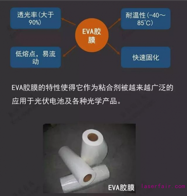 EVA是聚乙烯-聚醋酸乙烯酯共聚物的簡稱,是一種熱固性有粘性的膠膜,用於(yu) 放在夾膠玻璃中間。由於(yu) EVA膠膜在粘著力、耐久性、光學特性等方麵具有的優(you) 越性,使得被越來越廣泛的應用於(yu) 電流組件以及各種光學產(chan) 品。