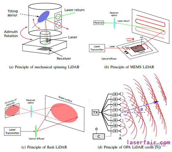 6)尺寸較小,便於(yu) 集成。目前,各種可能的解決(jue) 方案,從(cong) 激光源(905nm V.S.1550nm)、掃描方法(自旋 /MEMS/OPA/Flash)或測距原理(ToF 或 FMCW)都被用來克服這些困難。