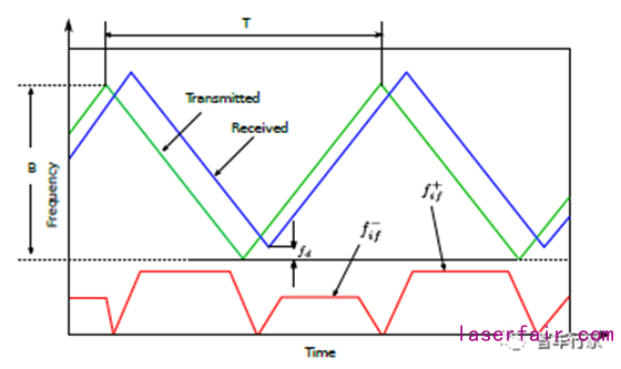圖 3:相幹探測原理:通過混合發射和接收的光波產(chan) 生的中頻(紅色跡線)來估計距離。