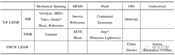 表一:具有代表性的激光雷達製造商和采用的技術。標有*的製造商使用單光子蓋革模式 SPAD 作為(wei) 光電探測器。