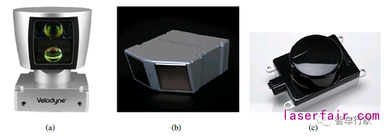 (a)來自 Velodyne 的機械旋轉 905nm 激光雷達,(b)來自 Luminar 的 1550nm MEMS 激光雷達、(c)大陸公司的 Flash 激光雷達。