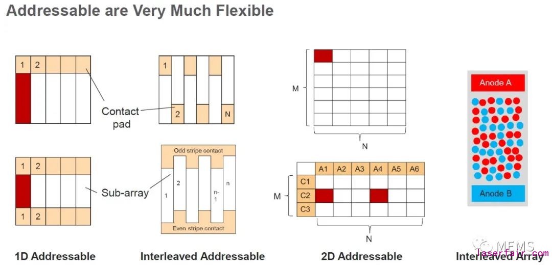 (3)2D可尋址VCSEL(下圖左起第三張圖),有兩(liang) 種實現方式,分別為(wei) 共陰極、多陽極形式,和獨立陰極陽極形式;