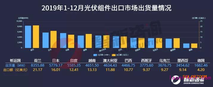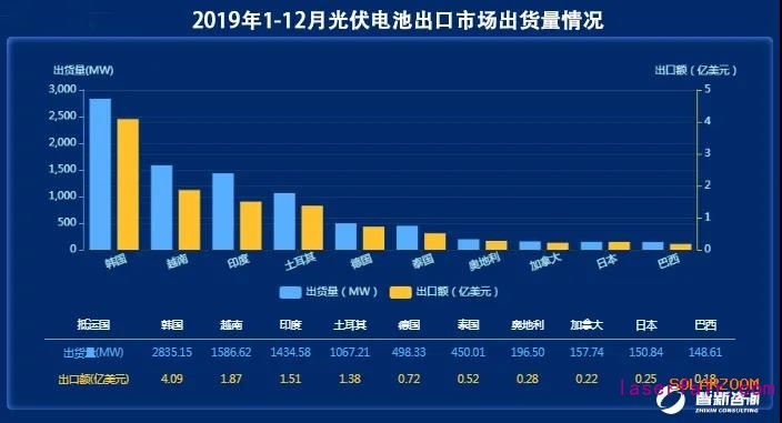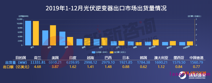 根據智新谘詢統計,2019年中國光伏組件、電池、逆變器主要出口國家(地區)如下: