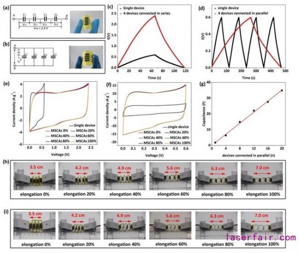 圖2:微型超級電容器陣列串聯/並聯的結構圖、電學示意圖、電容性能及在拉伸過程中的電學輸出性能。