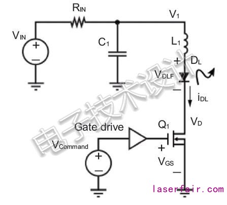 Q1和DL分別是待激活的激光器的開關(guan) 和LED。一旦控製器關(guan) 閉,C1電容器就立即充電至VIN電壓。當Q1導通時,C1通過DL和L1電感放電,從(cong) 而就形成了諧振電路。因此,流過激光器的電流就是正弦脈衝(chong) iDL,直到LED兩(liang) 端的電壓高於(yu) 其正向電壓VDLF為(wei) 止。當DL上的電壓小於(yu) VDLF時,C1再次開始充電。